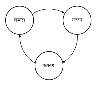 বিজ্ঞানভিত্তিক বিপ্লবের চক্র। শুধু গবেষণা দিয়ে বিজ্ঞান এগিয়ে যেতে পারে না। এর জন্য দরকার হয় বিজ্ঞান, রাজনীতি আর অর্থনীতির সম্মিলিত উদ্যোগ। রাজনৈতিক এবং অর্থনৈতিক প্রতিষ্ঠানগুলো যোগান দেয় বিজ্ঞানের এগিয়ে চলার রসদ যা ছাড়া বৈজ্ঞানিক গবেষণা এগিয়ে নেয়া মোটামুটি অসম্ভব। বিনিময়ে বিজ্ঞান দেয় নতুন ক্ষমতা আর শক্তি যা ব্যবহৃত হয় নতুন সম্পদ তৈরিতে। এরই কিছু অংশ আবার বিনিয়োগ করা হয় বৈজ্ঞানিক গবেষণার কাজে।